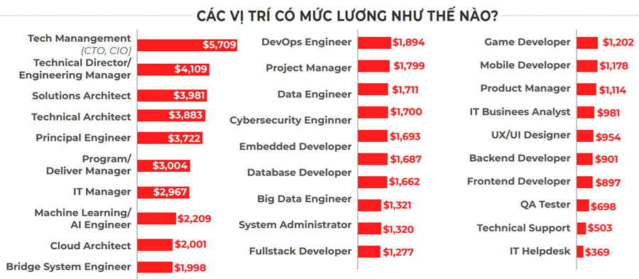 Mức lương được trả theo năng lực và số năm kinh nghiệm mà bạn có đồng thời phản ánh giá trị mà bạn mang lại cho công ty. Sân chơi này công bằng cho những người có năng lực thật sự. Phía dưới là mức lương trung bình các công ty trả cho các vị trí bạn đảm nhiệm, mang tính chất tham khảo.